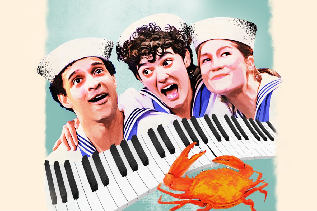 This show was developed intimately with and for these three actors - Ellen, Elliot, and Bailey - who I met in graduate school in San Diego and fell recklessly in love with. When the actors inhabit the sailor archetype, we get to see both this foundational genre trope refracted 3x through an inquisitive contemporary lens, and we get to see the actors themselves, amazingly themselves, playing (shredding) on a huge and liberating canvas. Also in San Diego, appearing like a miracle, was director Aysan Celik (who teaches courses on Buster Keaton, and once cut a safely choreographed sequence because “it’s better when the actors get to do whatever they want”) plus indispensable music teammate Padra Crissafulli and virtuosic pianist Kyle Adam Blair (who once called the score “Gershwin meets Yellowcard”). San Diego, in a sinister twist, is a military town: warships dot the horizon, Top Gun-style jets drill maneuvers in the sunset. Sailors stroll the beach - actual sailors! You can’t believe your eyes - it’s too good to be true - mythic creatures sprung impossibly to life. But wait… are those guns at their hips? Is this adorable sailor… about to commit war crimes? Or die? You feel scared of them - you feel scared for them - you feel turned on - you feel pity - you feel humbled. You feel acutely you are on conquered land, at the edge of a warming continent. And there we all were, picking our noses and studying theater! While the last scraps of American democracy withered around us! Ancient Athens comes to mind, theater & democracy & war, something about that. And something about… On The Town.