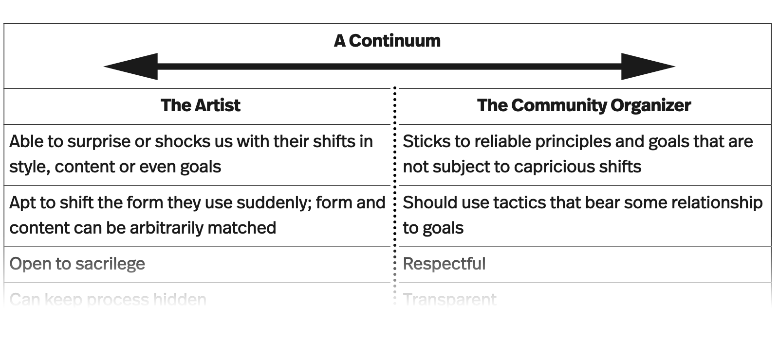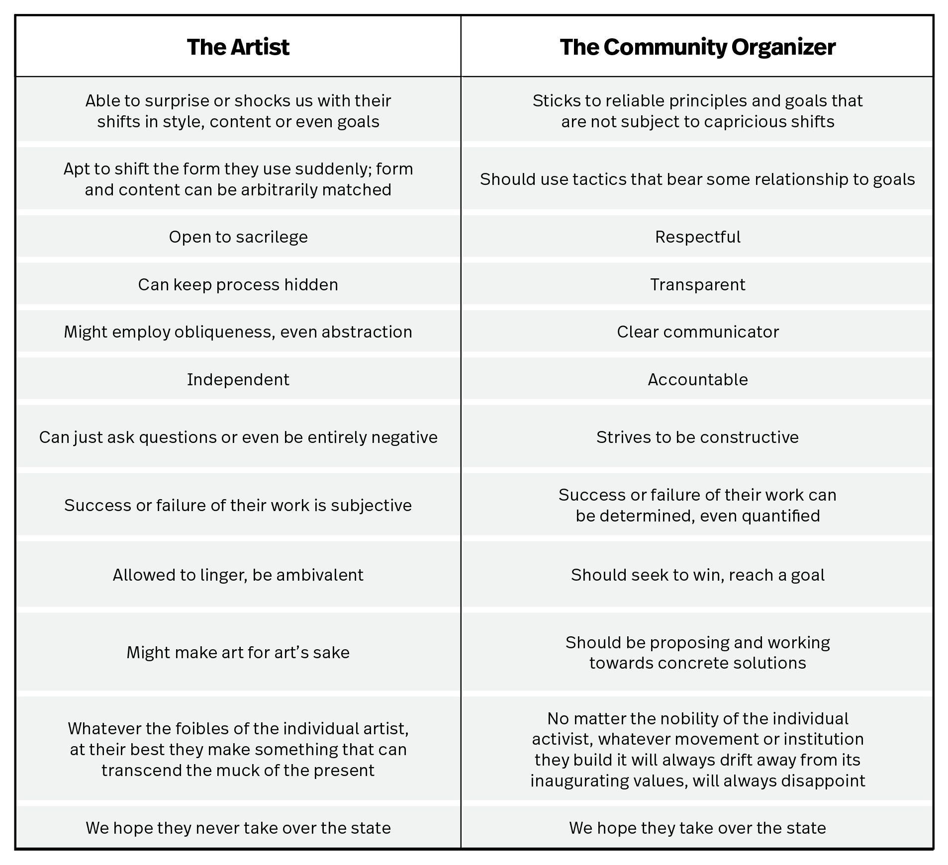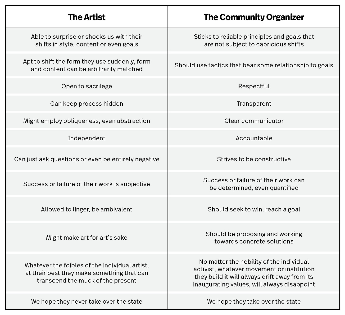 Many years ago – after I had worked for a long time as a community organizer, burned out, then started writing plays – I had reason and time enough to think about the differences between making social change and making art. I made a chart to lay out the differences. In one column, I listed the traits of an ideal artist and in the other I listed the traits of an ideal community organizer. I’ve lost the original; here’s a reconstruction: